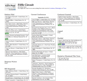 Petitions are broken out by state or circuit. For example, here are the pending U.S. Supreme Court cases from state courts in Texas. This set includes cases from the Texas Supreme Court (rare), Court of Criminal Appeals (common), or the intermediate courts of appeals (pretty common, after the Texas Supreme Court denies review). A different page shows the federal Fifth Circuit cases now pending in the U.S. Supreme Court.