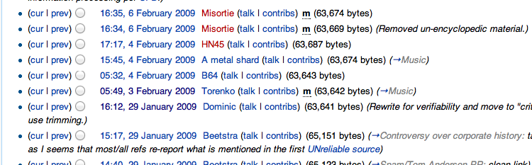 But with Wikipedia, as many of you know, there is a revision history. You can browse an article’s edits with its “View History” tab, right next to the search box in the top right.